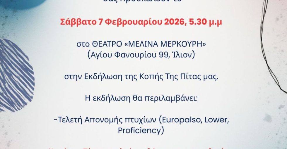 Τα Κέντρα Ξένων Γλωσσών «Νεκτάριος Αδαμόπουλος» (Περιστέρι – Ίλιον) σας προσκαλούν σε μια ξεχωριστή γιορτινή εκδήλωση, αφιερωμένη στους μαθητές μας, στις επιτυχίες τους και στη χαρά που μοιραζόμαστε κάθε χρόνο με τις οικογένειές τους.